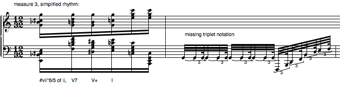 As an aside, the 12/32 time signature could throw a diligent music student for a loop. The music appears to have three beats in each measure; that is, each beat ought to add up to an 8th note (a quaver, for you Brits out there). Each of the three beats ought to contain the value of four 32nds (demisemiquavers!) in order to add up to 12. Though a modern reader might expect this to be a compound meter with 4 beats of three 32nds, it clearly is not. Trouble is, if you read the notation literally each beat of measure 3 is five 32nds in the upper staff, totaling fifteen, while the lower part of the same measure has 18 of them. The next measure doesn't work out either. It's because Beethoven has not included the triplet indications that would be necessary to make the beats come out even. That's no wonder; all those triplets would be very busy visually, and the guy was writing with a goose feather. It's something to keep in mind, though, if you want a computer to play this correctly. The solution is that 32nds followed by 32nds are as written; a 32nd followed by a 64th is really a triplet. Do that, and all is well. |
