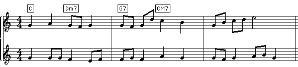 This unedited idea from Songworks was created to four chords of human invention. The program then created a treble clef tune to go with them, and then we added another treble clef staff and asked Songworks to come up with another tune to follow the same harmony.