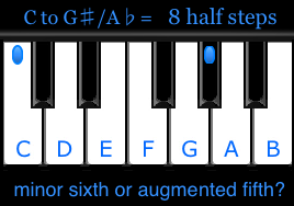 The intervals C to G sharp and C to A flat each contain 8 half steps but have different names. C to G sharp covers five letter names and is