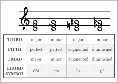 are a fifth apart. A triad can be major, minor, augmented or diminished depending on the qualities of its thirds.