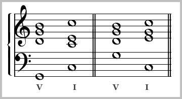 • Root movement by an upward fourth or downward fifth: The first thing we notice is that the root of the tonic chord is a fourth above the root of the dominant. Or, if we move in the opposite direction, it’s a fifth below.